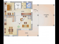 Дом имеет два этажа, обеспечивая комфорт и уют в тихом, живописном месте. На первом этаже находится современная кухня с островом, соединенная с гостиной, к которой примыкает камин и выход на крытую террасу, а также гостевая спальня и ванная комната. Второй этаж включает в себя две спальни, одна из которых имеет просторную гардеробную и доступ на террасу, которая может использоваться как зимний сад или зона для джакузи, детскую комнату, большую ванную и помещение для хозяйственных нужд.