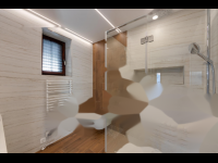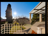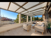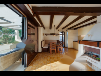Верхний этаж включает в себя прихожую, просторную гостиную с камином и выходом на террасу, кухню с выходом на собственную террасу, также оснащённую камином, спальню с выходом на террасу, детскую комнату с двумя кроватями, ванную и отдельный туалет. Из гостиной и спальни можно выйти на большую террасу с великолепной панорамой моря. Из кухни также предусмотрен выход на небольшую террасу с внешним камином.