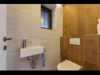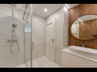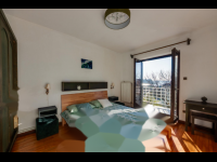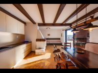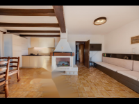 Здание состоит из двух независимых жилых единиц, каждая из которых имеет отдельный вход. На нижнем этаже располагаются кухня, гостиная с камином, ванная, отдельный туалет, детская комната с двумя кроватями и спальня, которая ведет на террасу с потрясающим видом на Марину. Около входа также есть крытая терраса, оборудованная внешним камином.